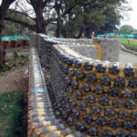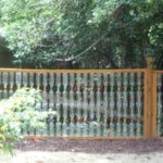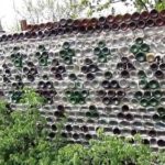 Вполне креативной идеей будет создание панно на забор из донышек пластиковых бутылок. Воплощается эта идея при строительстве «кирпичного» забора, когда бутылки наполняются утяжелителями и укладываются в стену в виде кирпичей.